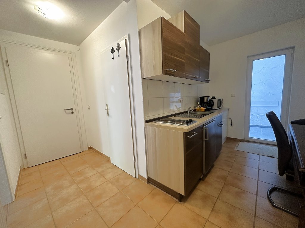 Das Apartment im Erdgeschoss bietet einen liebevoll gestalteten Wohn- und Schlafbereich mit einem Sessel und einem Flachbildfernseher mit Satellitenempfang. Die voll ausgestattete Kochzeile umfasst einen Elektroherd, zwei Kochfelder, Mikrowelle, Kühlschrank, Kaffeemaschine, Toaster und notwendiges Geschirr. Der Essbereich mit Tisch und drei Stühlen lädt zu gemeinsamen Mahlzeiten ein.