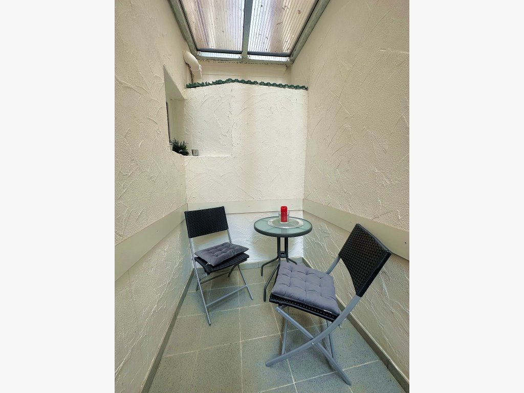 Der kleine Balkon mit Gartentisch und zwei Stühlen lädt an heißen Sommerabenden zum Entspannen im Schatten ein.