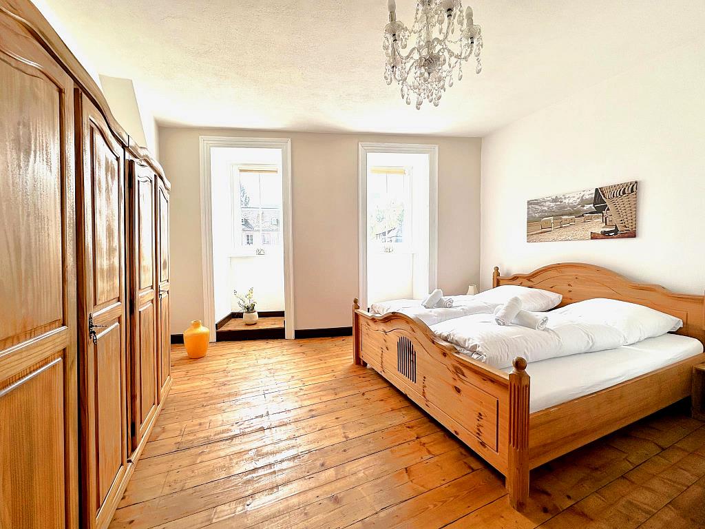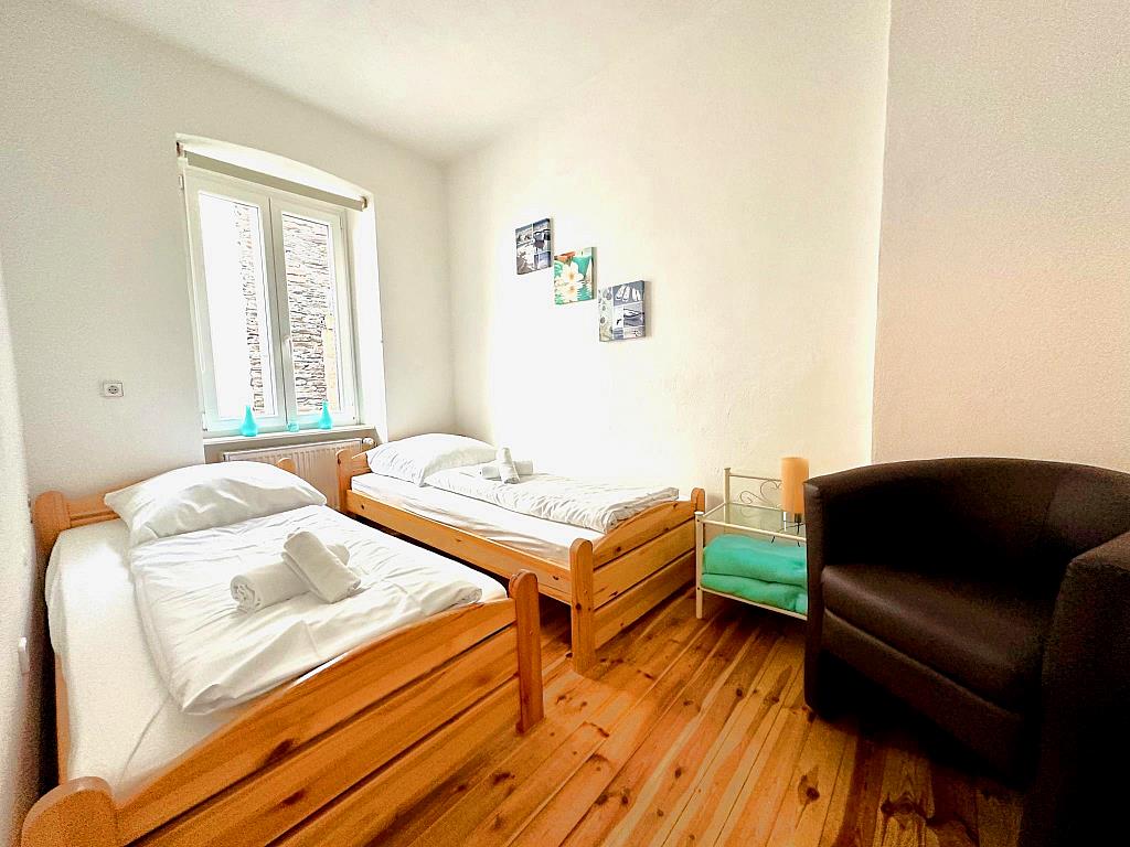 Die Ferienwohnung im zweiten Obergeschoss bietet einen gemütlichen Wohnraum mit einer Couch, zwei Sesseln und einem Flachbildfernseher. Im Schlafbereich stehen zwei Einzelbetten. Die voll ausgestattete Küche verfügt über eine moderne Kochzeile, Elektroherd, Backofen, Mikrowelle, Kühlschrank, Gefrierfach, Kaffeemaschine, Wasserkocher, Toaster sowie Geschirr und Besteck. Ein Essbereich mit Tisch und Stühlen lädt zum gemeinsamen Genießen ein. Im Schlafzimmer finden Sie ein Doppelbett, einen Sessel, einen Schrank und Bettwäsche. Das Badezimmer ist mit Dusche, WC, Waschbecken, Spiegel, Föhn sowie Handtüchern ausgestattet.
