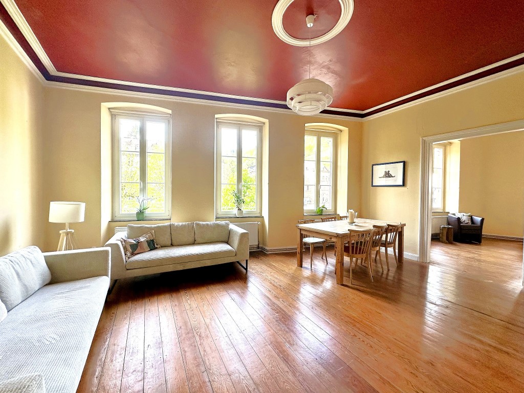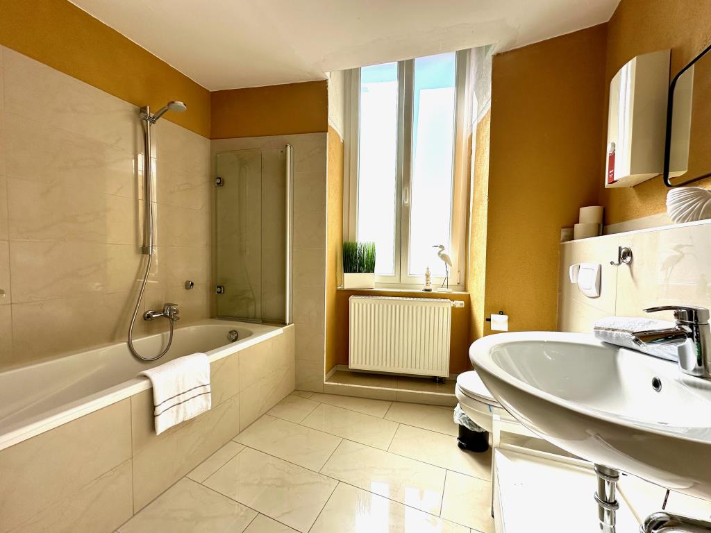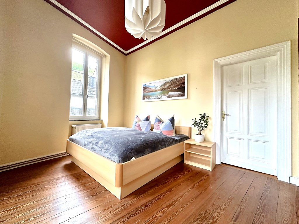 Unsere Ferienwohnung "Zur Stadtmühle" bietet gemütliches Wohnen im ersten Obergeschoss. Diese Ferienwohnung verfügt über zwei Schlafzimmer, jedes mit einem komfortablen Doppelbett, Sessel, Nachttischen und einem Sideboard ausgestattet. Im geräumigen Wohnzimmer finden Sie zwei bequeme Couchen, perfekt zum Entspannen nach einem ereignisreichen Tag. Ein Flachbild-TV und eine Auswahl an Brettspielen sorgen für Unterhaltung. Der Essbereich ist mit einem großen Tisch und sechs Stühlen ausgestattet, ideal für gesellige Mahlzeiten mit der Familie oder Freunden. In der gut ausgestatteten Küche mit Küchenzeile finden Sie alles, was Sie für die Zubereitung von Mahlzeiten benötigen, einschließlich Elektroherd, Backofen, Mikrowelle, Geschirrspüler, Kaffeemaschine, Wasserkocher und Toaster. Kochutensilien sowie ein Abfalleimer sind ebenfalls vorhanden. Für zusätzlichen Komfort gibt es ein Gäste-WC mit WC und Waschbecken sowie ein Badezimmer mit Badewanne, Dusche, WC, Waschbecken, Spiegel, Föhn und ausreichend Handtüchern und Duschtüchern. Ein DAB-Radio, Satelliten-TV und ein Smart-TV stehen zur Verfügung, um Ihre Unterhaltungsbedürfnisse zu erfüllen. WLAN ist kostenlos verfügbar.